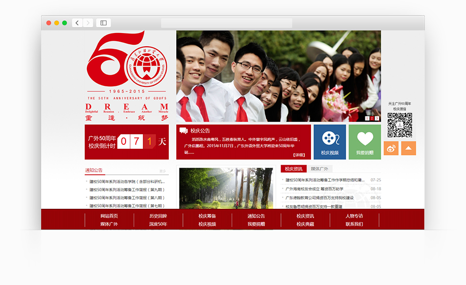 2015年11月7日,广东外语外贸大学将迎来50周韶华诞。广东外语外贸大学建校50周年校庆网(http://gw50.gdufs.edu.cn/) 是广东外语外贸大学建校50周年校庆专题网站。网站使用统一的信息架构,为信息资源与使用用户搭建一座畅通的桥梁,不仅能高效发布校庆信息,回顾学校办学历程,展示发展成果,构筑学校浓厚的历史文化,还可以轻松共享教育资源信息,为学校信息化教育增添了新的手段。前台页面设计针对校庆主题提供了多个栏目用于庆祝校庆,发布校庆信息,方便校友交流互动,外建校五十周年校庆网站“广外50年”以鲜艳的红色为主色调,搭配清新明亮的蓝、绿、黄等颜色,网站图文并茂、动静结合,营造一种青春洋溢、欢快喜庆的氛围。网站各个版块和栏目经过精心的考量和设计,共设有历史回眸、校庆筹备、通知公告、校庆资讯、人物专访、媒体广外、深度50年、校庆视频、我要捐赠、校庆典藏等10个栏目,此外,前台还提供了校庆倒计时功能。通过校庆专题网站