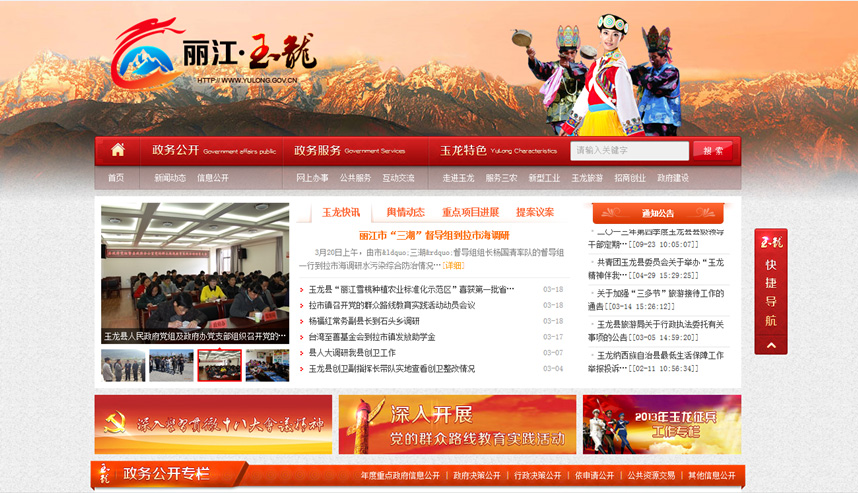 玉龙县人民政府网站建设时间早。改版前,网站运行不稳定、资源分散,功能不足,信息质量、更新速度等缺乏规范的运行保障机制,信息公开,政民互动、网上办事等重要功能缺失。