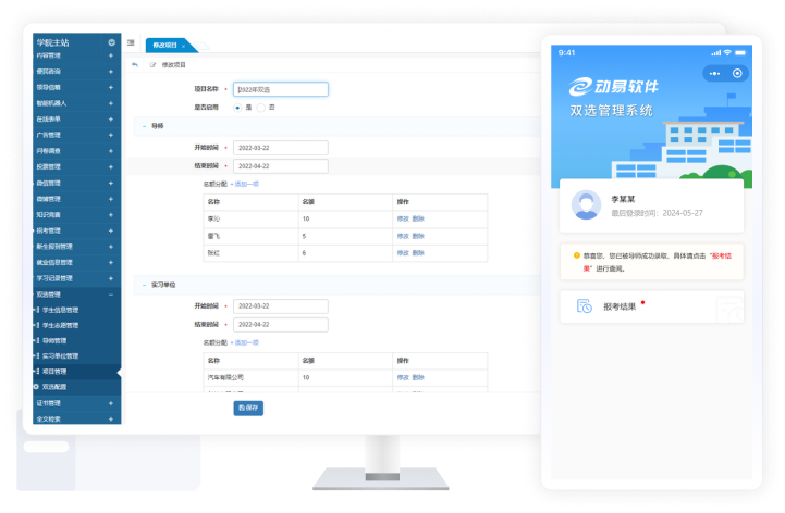 支持设置项目信息,包括设置项目的开始时间和结束时间,以及学生可以选择的导师和实习单位,以及相应的名额。