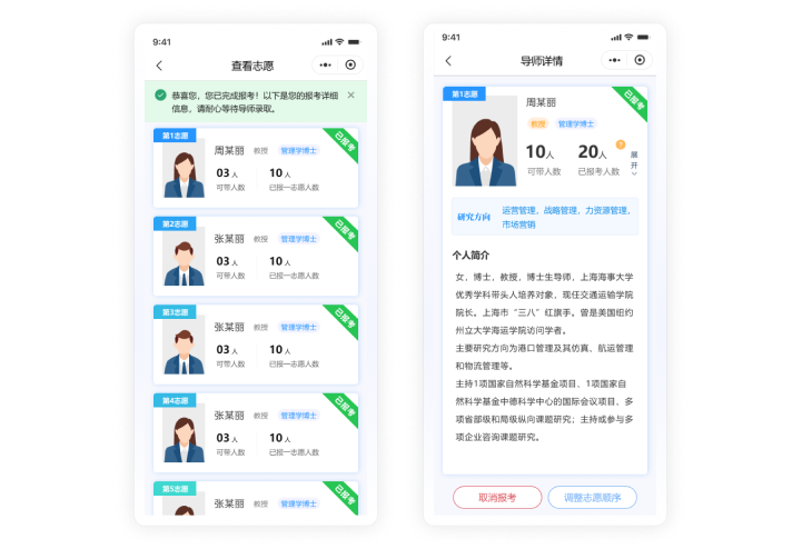 在报考截止时间之前,学生可以随时查看和调整报考志愿,包括取消报考或通过拖拽方式调整志愿顺序。每个导师的报考名额有配置限制。