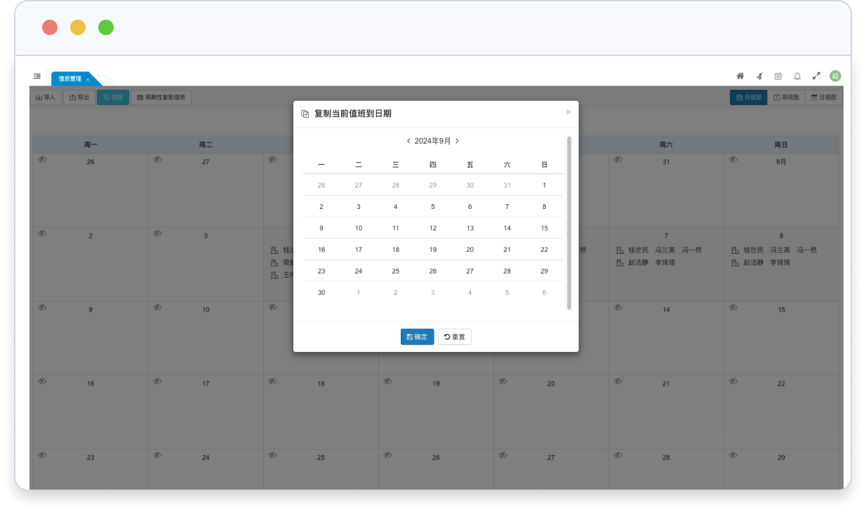 - 支持将某一天已排好的值班信息复制到其他日期,以便在多天排班信息相同时一步完成,提高排班效率。