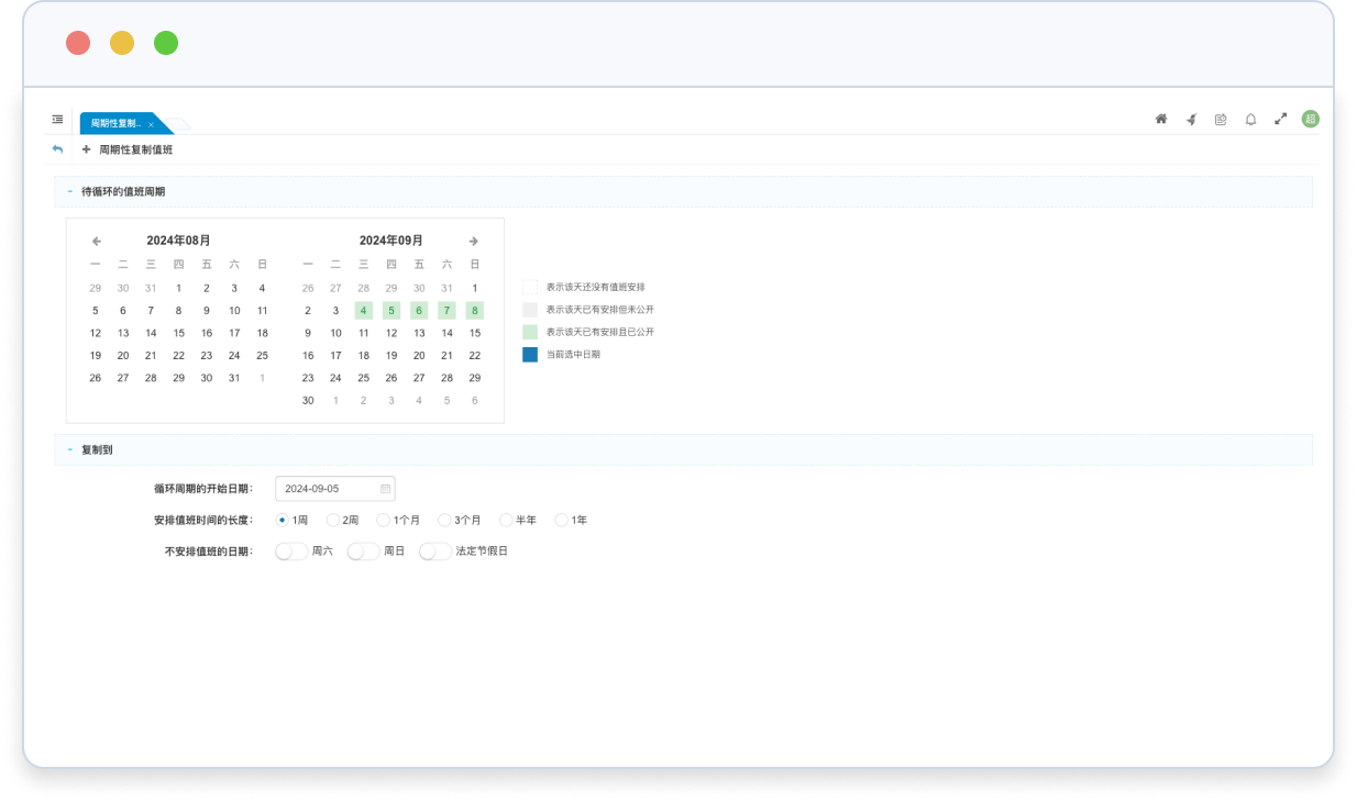 - 支持按周期复制值班功能,可快速的安排好未来一段时间的值班。