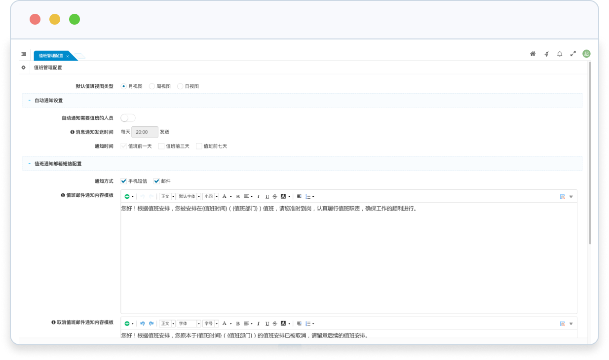 - 支持在值班前一天/三天/七天自动给值班人员发送值班通知。通知方式支持邮件和手机短信,通知内容支持自定义。