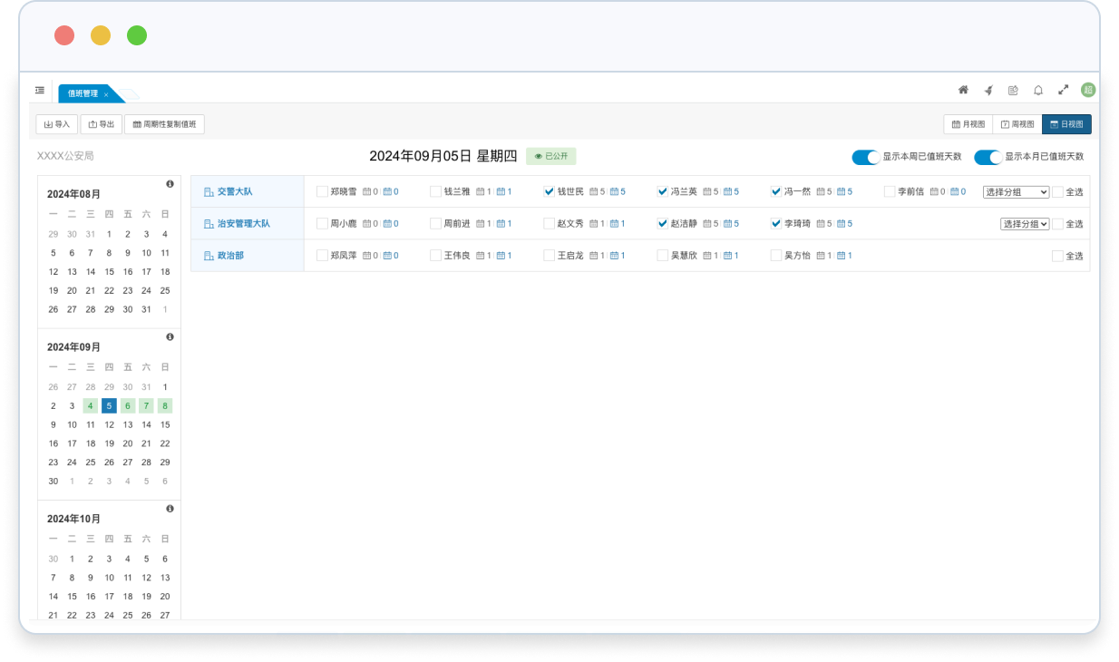- 排班时可实时查看人员当周值班情况及当月累计天数,避免过度排班;