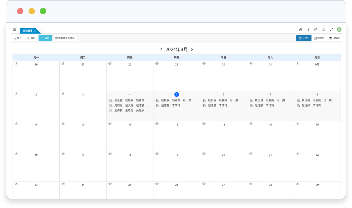 - 所见即所得的排班界面,提供日/周/月视图排班模式,适配不同规模人员调度;