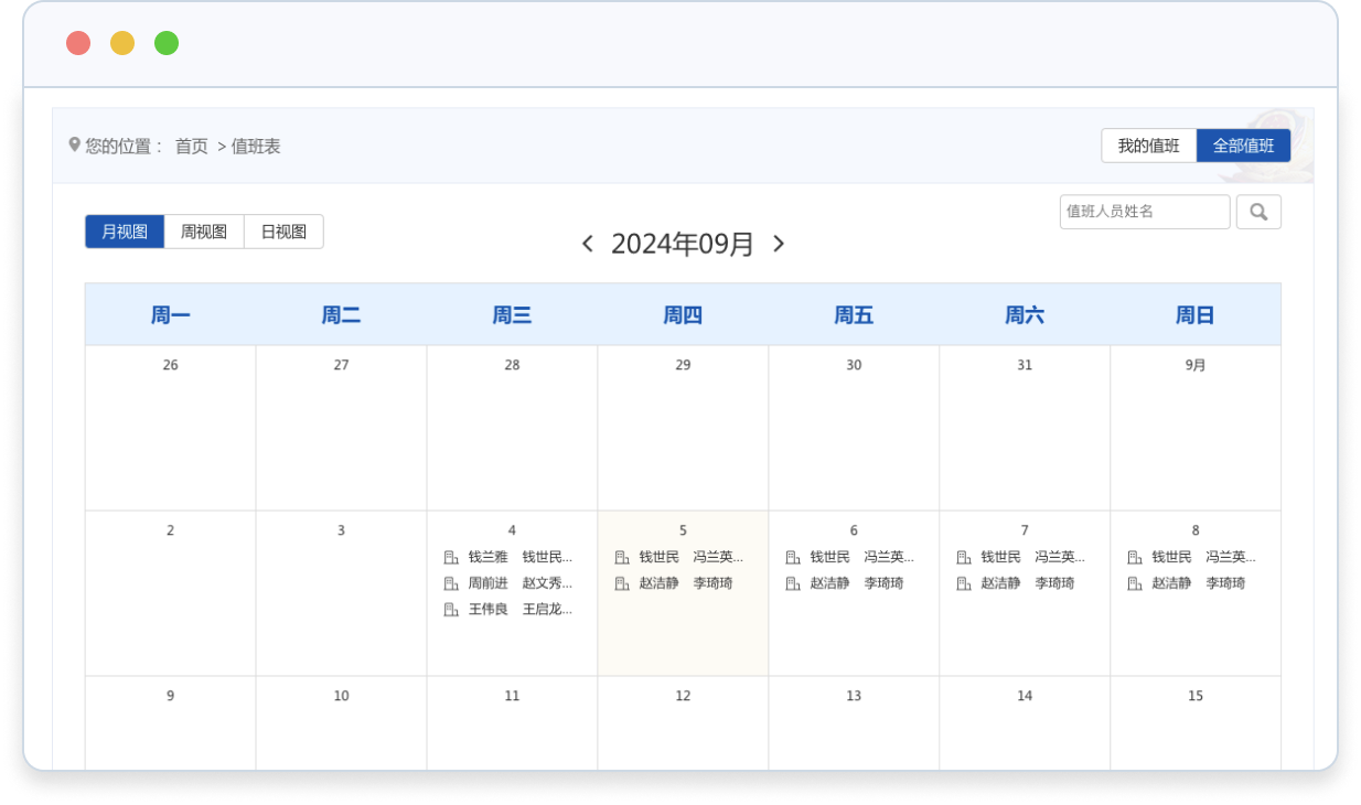 - 值班信息列表页与后台相同,提供月视图模式来显示每月的值班信息,提供周视图模式来展示每周的值班信息,提供日视图来查看指定日期的值班表,并且支持在月视图、周视图、日视图之间自由切换。用户还可以从月视图或周视图中点击查看特定日期的值班表,支持按人名搜索值班安排,且能够同时搜索多个人。