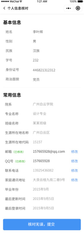 支持毕业生对本人信息进行核对,如信息有误可在小程序中修改并提交,院系用户或辅导员(管理员)将对提交信息进行数据审核,系统将自动记录修改的具体字段及展示修改前后的内容对比,以确保数据更新的准确性和可追溯性。