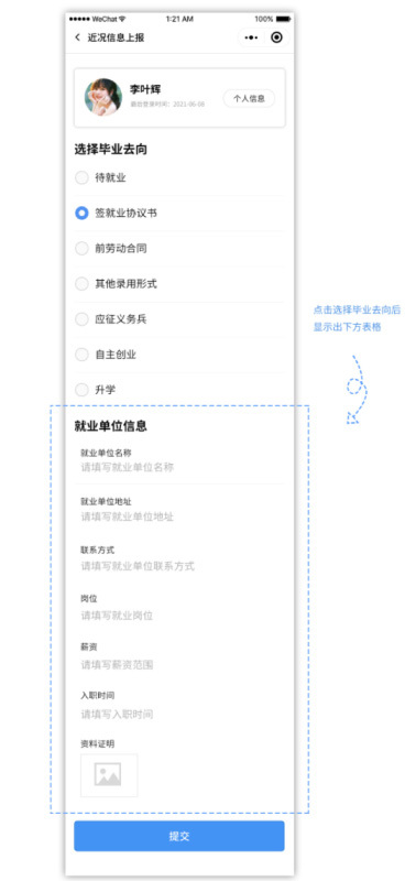 毕业生就业信息上报毕业生根据自身实际情况,在小程序中选择当前状态(待就业、签就业协议书、签劳动合同、其他录用形式、应征义务兵、自主创业、升学),小程序根据所选状态提供不同的表单、选项供毕业生填写。