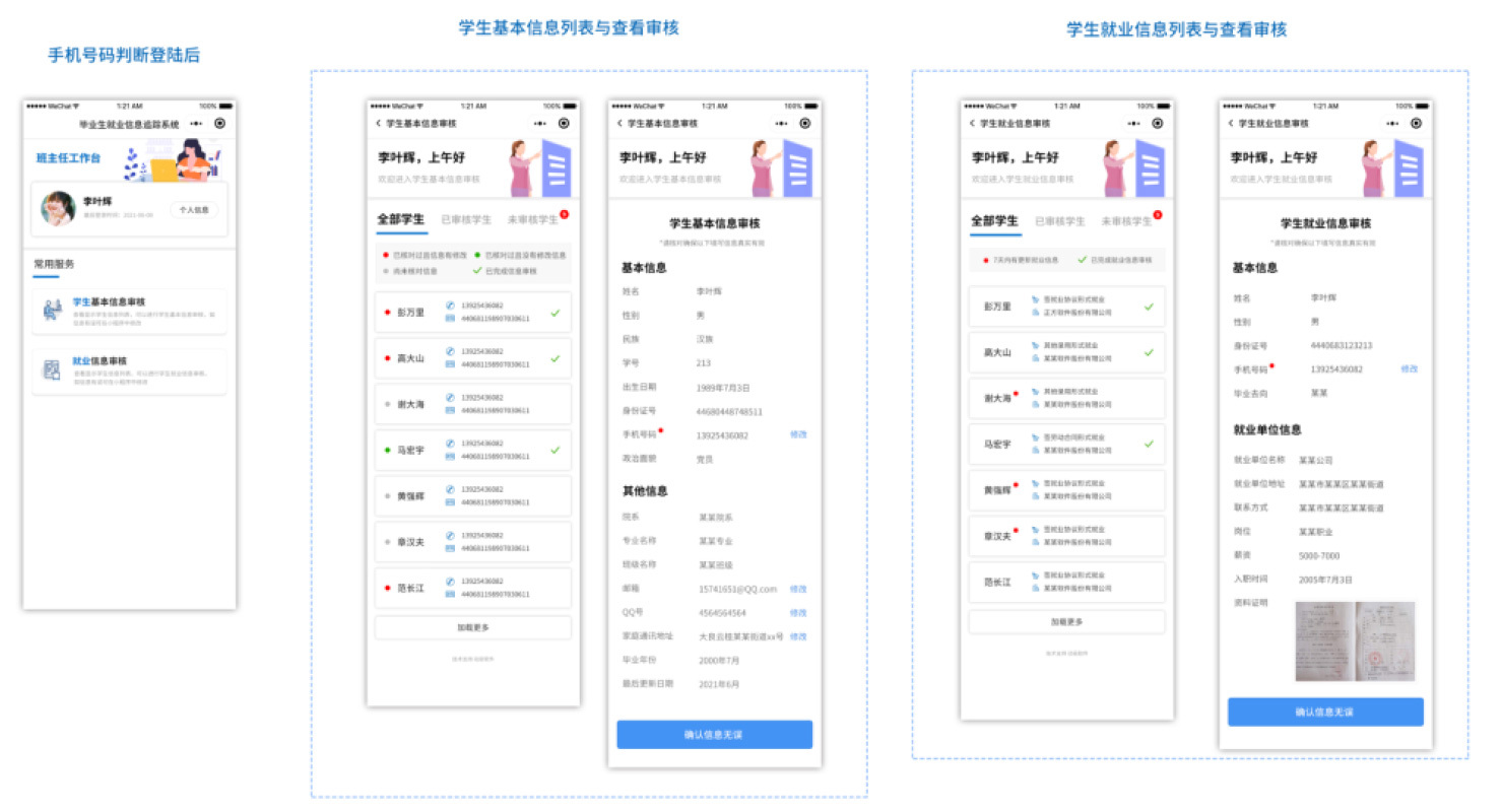 班主任(辅导员)扫码进入小程序,小程序自动申请获取当前微信账号绑定的手机号进行身份验证,识别并确认班主任身份后,直接进入班主任工作台界面,班主任能够进行学生基本信息与就业信息的审核工作。