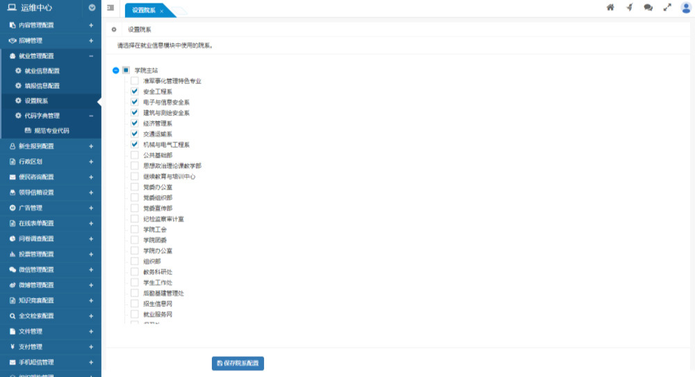 院系、专业、班级管理院系为全局部门的子集,可以配置全局部门中在就业信息管理模块中启用的部门做为院系。