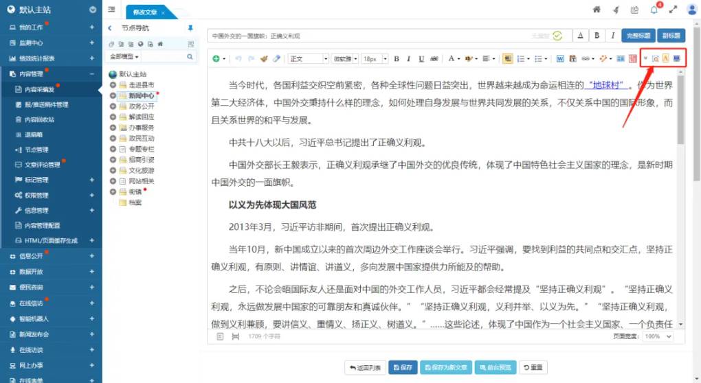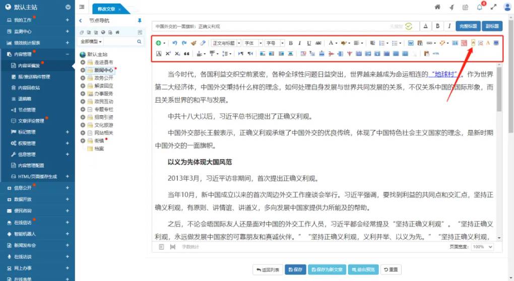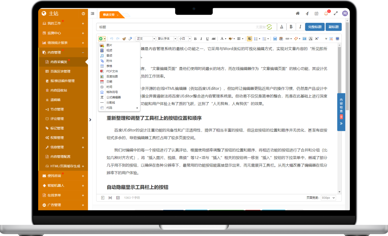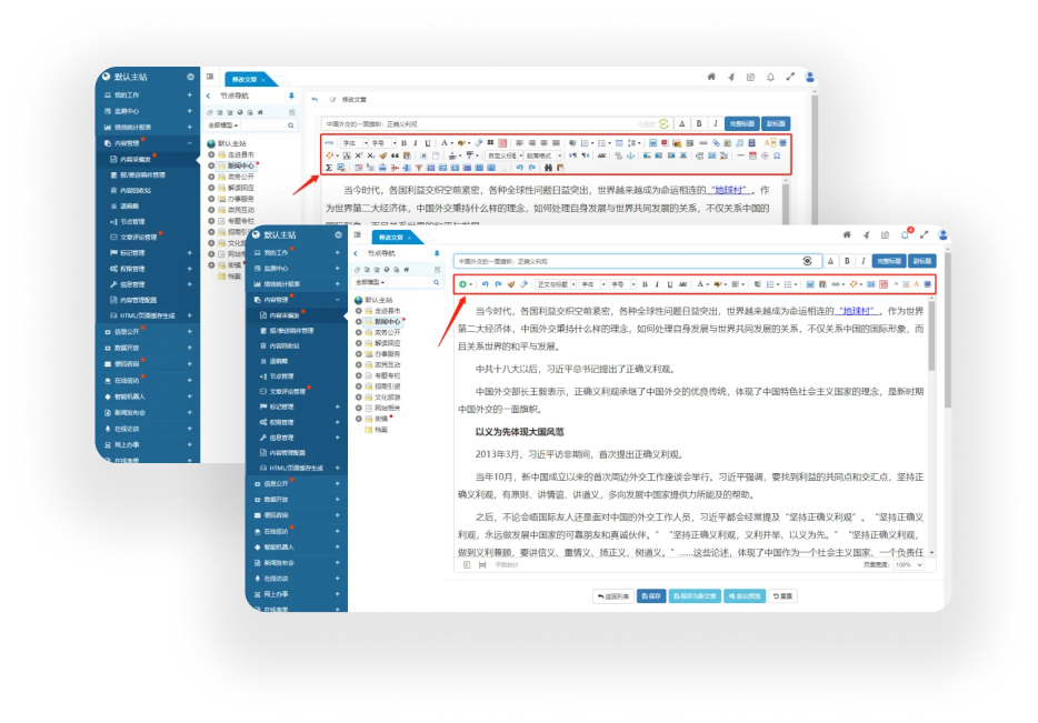 在线 HTML 编辑器是内容管理系统的最核心功能之一,它采用与 Word 类似的可视化编辑方式,实现对文章内容的“所见即所得”的在线编辑效果。