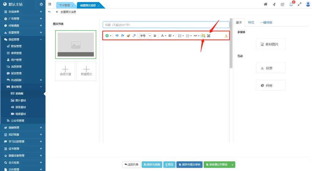专为微信发布内容编辑设计,增加了调用第三方编辑工具的功能按钮。