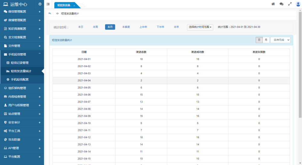 提供按日和按月两种统计表。统计每日/每月发送的短信发送总量、发送成功数量、发送失败数量。便于与短信服务商进行对帐。