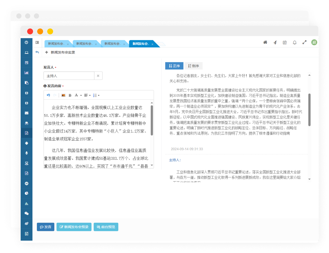 系统涵盖新闻发布管理、发布会预录管理、视频直播与录播、新闻图文直播(实时推送)、网友提问、相关内容管理与分类管理、新闻发布会配置等功能模块。支持图文直播与视频直播功能,并内置文字敏感词过滤功能,确保发布内容的安全与合规。