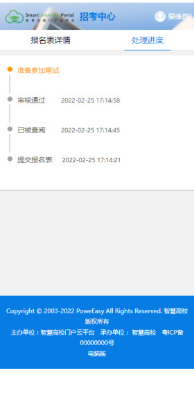 在报名表的上方,通过进度条显示当前状态、处理过程和结果,使得应聘者(考生)和招聘负责人都能一目了然地了解报名表的进展情况。