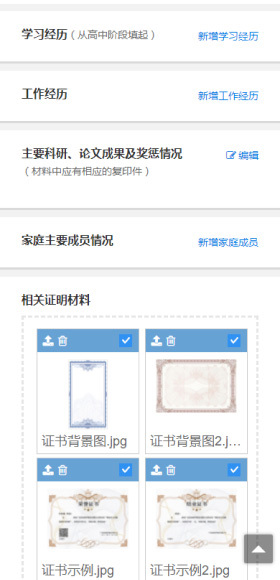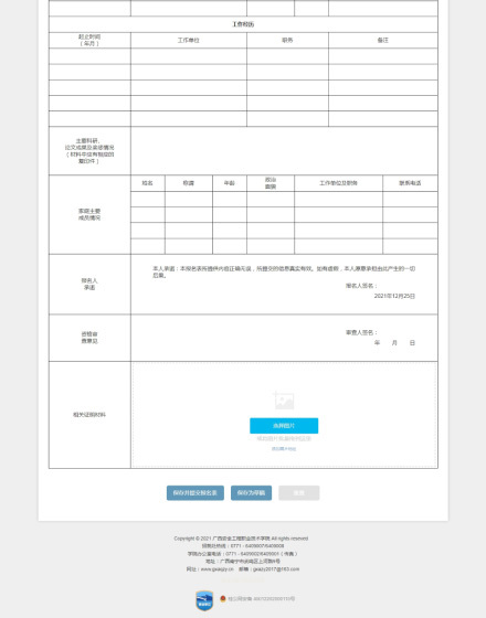报名表的填写采用仿真界面,接近纸质报名表的样式,并支持上传相关证明材料(图片、视频、PDF、压缩文件等格式)。