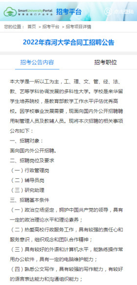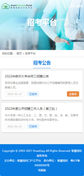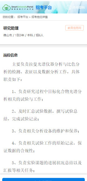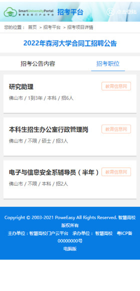 前台支持显示招考项目列表,用户可以点击项目名称查看详细信息,并在项目详情页中查看相关的招聘岗位列表。点击岗位名称后,可查看该岗位的详细信息。