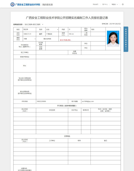 事业单位招考的报名表通常具有特定格式,与常规招聘简历差异显著。考虑到招考负责人和相关领导已习惯纸质报名表的样式,我们特别设计了高度仿真的报名表填写和查看界面,确保用户体验的一致性。