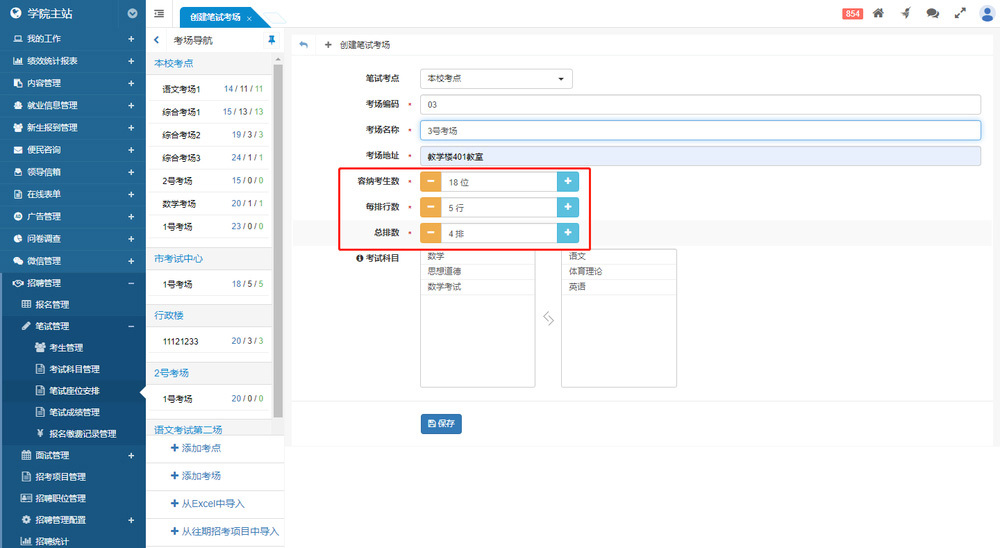 考场管理:支持创建、修改、删除考场,并对考场进行排序。考场创建完成后,会根据考场的容纳人数自动生成笔试座位记录(类似于飞机航班的座位安排,座位信息初始为空,待后续分派考生时填入)。