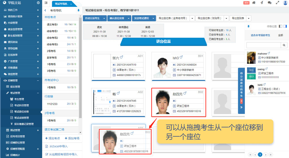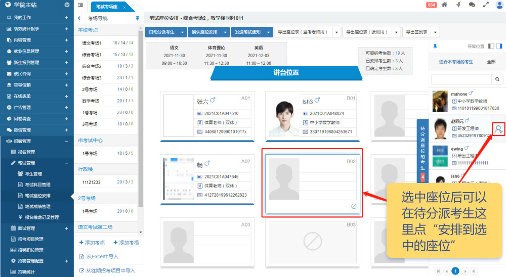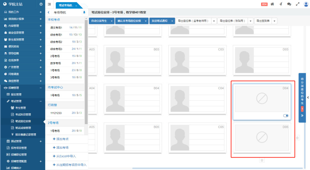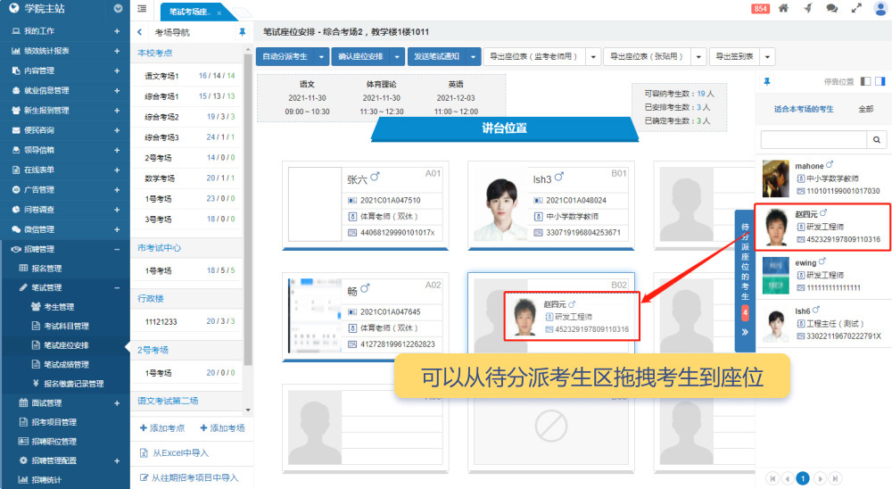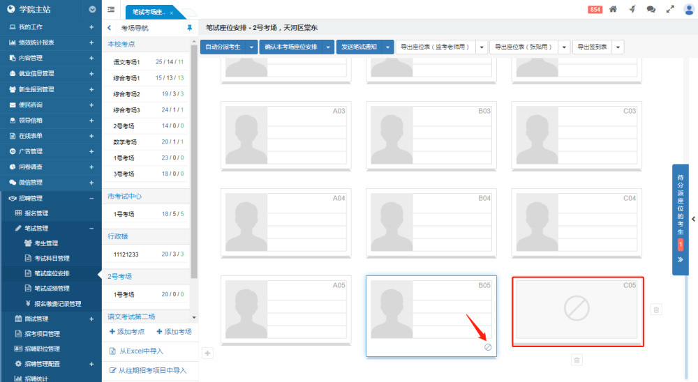 笔试考生管理界面类似于报名管理界面,中栏显示本次招考项目的职位列表,每个职位后面显示进入笔试流程的考生总数。如果有“待安排座位”的考生,会有红点进行提醒。中栏顶部支持切换不同的招考项目。