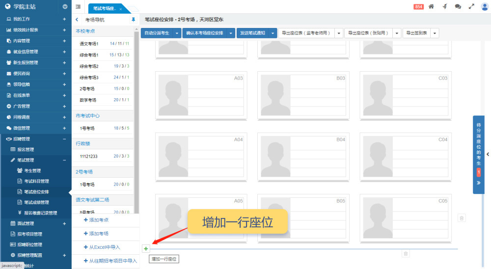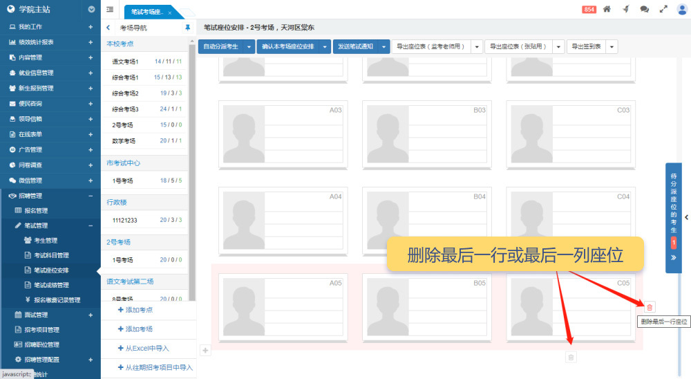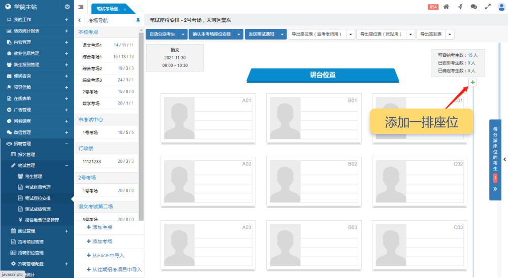 考点和考场的管理功能集成在“笔试座位安排”的考场导航中栏,无需单独的管理菜单。