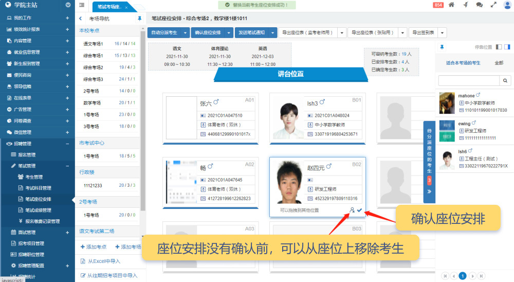 在后台管理界面中,中栏显示考点和考场导航信息。右侧展示座位安排表,以所见即所得的方式显示每个座位的考生信息。同时,右侧还包含“待分派座位的考生”区域(仅在有待分派考生时显示)。