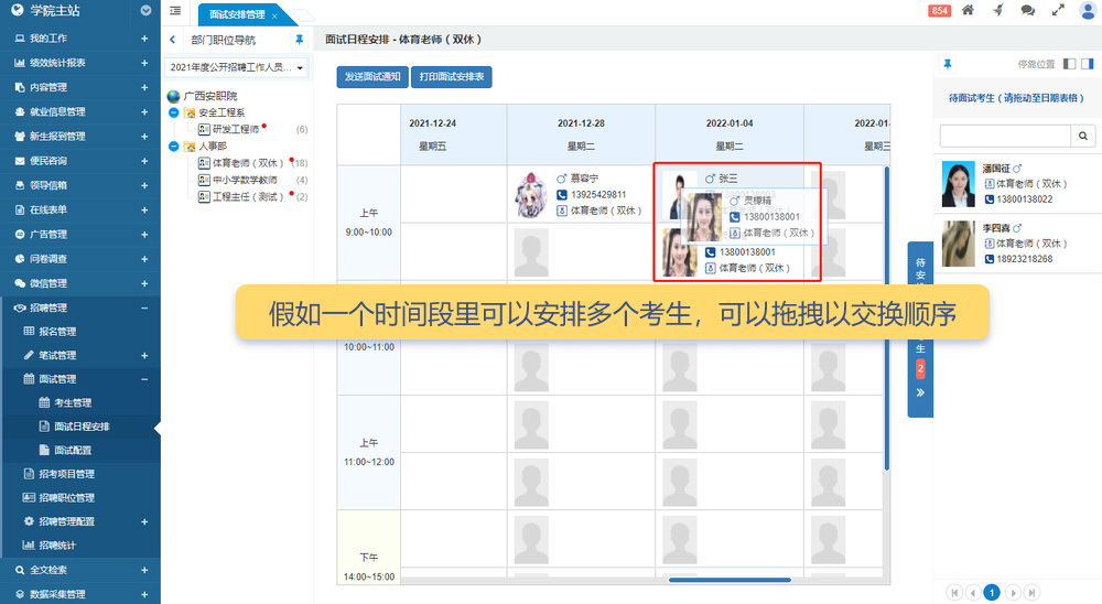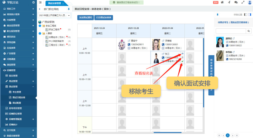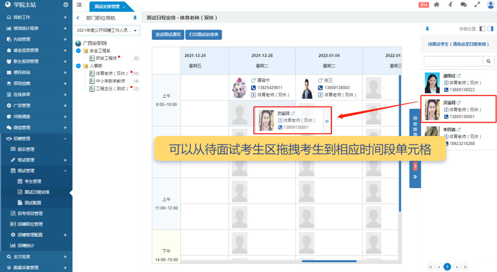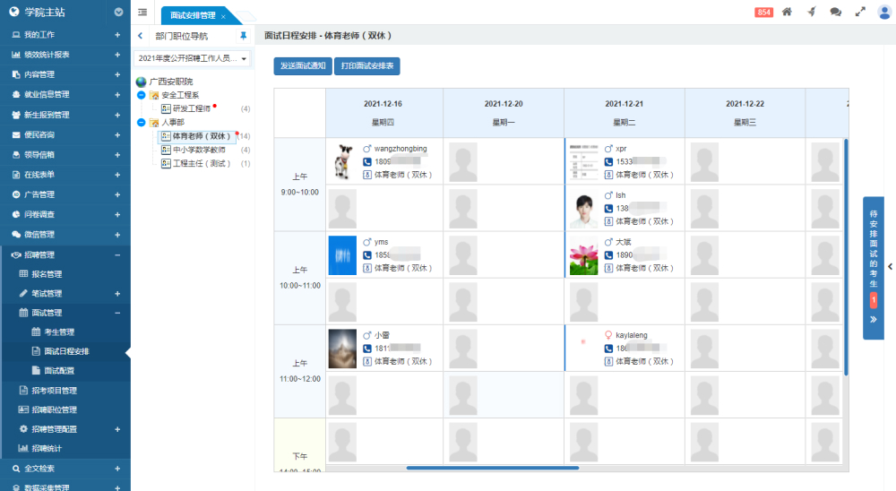 系统的中栏显示本次招考项目的职位列表,每个职位名称后标注进入面试流程的考生总数。若有“待安排面试时间”的考生,系统会以红点提示。右侧显示待安排面试的考生列表,中间则为面试日程安排表。