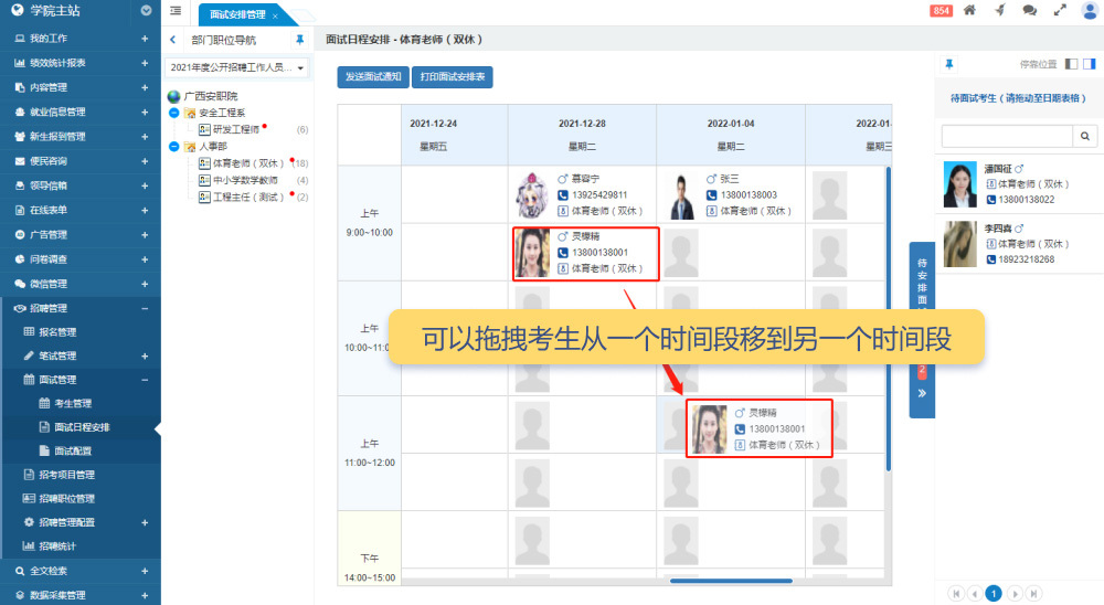 面试日程安排表的列为指定的招聘日期,行为面试时间段,每个单元格显示该时间段的已安排面试考生及其报考岗位。点击左侧的招聘岗位,表格将筛选出该岗位已安排面试的考生;点击右侧的“待安排考生”,表格则筛选出该考生对应岗位的已安排考生。用户可以将“待安排考生”拖拽到未安排面试的时间段,也可以在不同时间段间拖动考生。若一个时间段内有多个考生,还可通过拖拽调整顺序。已安排好的考生可随时移除以重新安排。