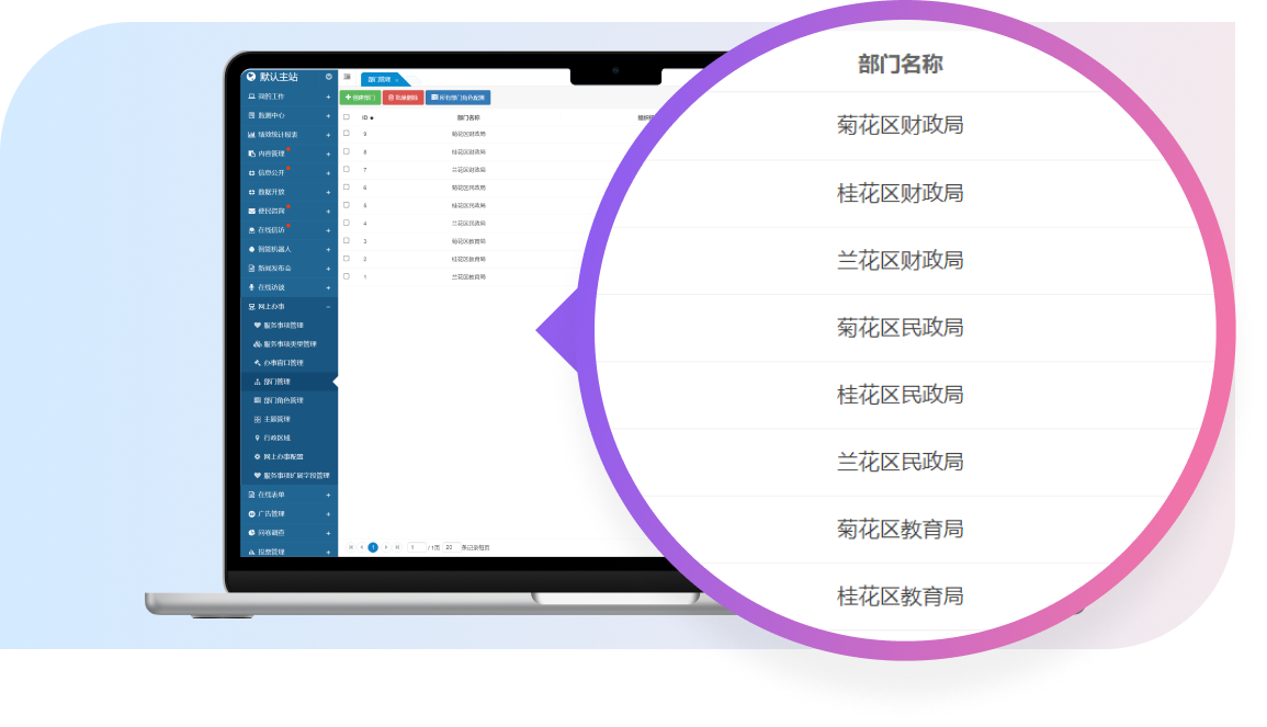 支持按所属行政区域进行筛选,管理人员能够基于地理位置或行政区划轻松筛选出相应部门,提升了管理的便捷性和精确度。