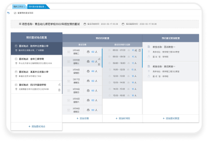 为解决每年预约面试的地点、日期、时间段、教室、学生的不同,我们独创设计了“预约项目管理”功能,通过以年为单位创建预约面试项目来完成每年的预约面试组织工作。同时,预约面试项目管理功能还可以完整的备份历史数据,方便日后归档和查阅。