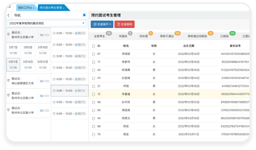 支持按照面试地点、日期、时间段进行筛选;可直观查看相应的名额和已报名人数;