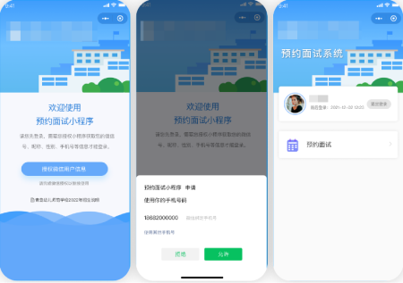 面试学生通过微信登录后可以在小程序上完成整个预约面试流程:预约面试、预约记录、报到、查看面试排队情况、查看面试结果。