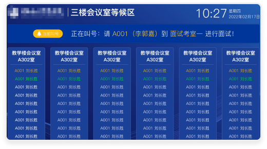 支持显示正在面试、准备面试、排队中的考生,并负责播放叫号语音;
