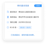 ● 已经完成面试,小程序主页变成我的预约记录的简要信息和和面试结果: 如果还没有结果,则显示“已完成面试,请等待面试结果”;如果已经有 面试结果后,则显示面试结果。