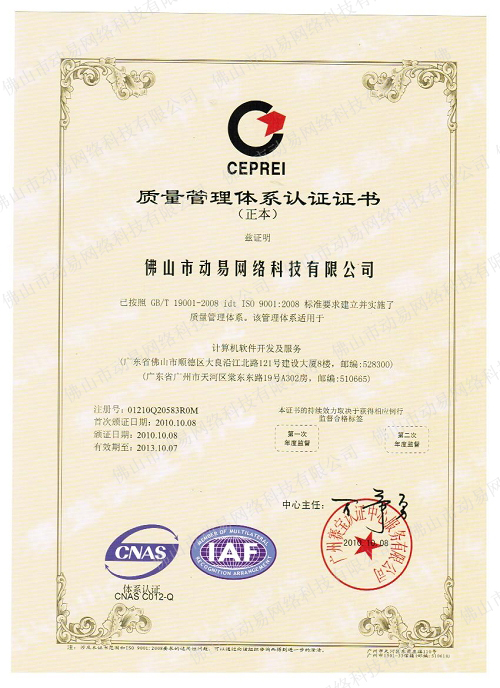 近日,佛山市动易软件科技有限公司正式通过赛宝认证中心的认证审核,取得了ISO9001:2008质量体系认证证书。