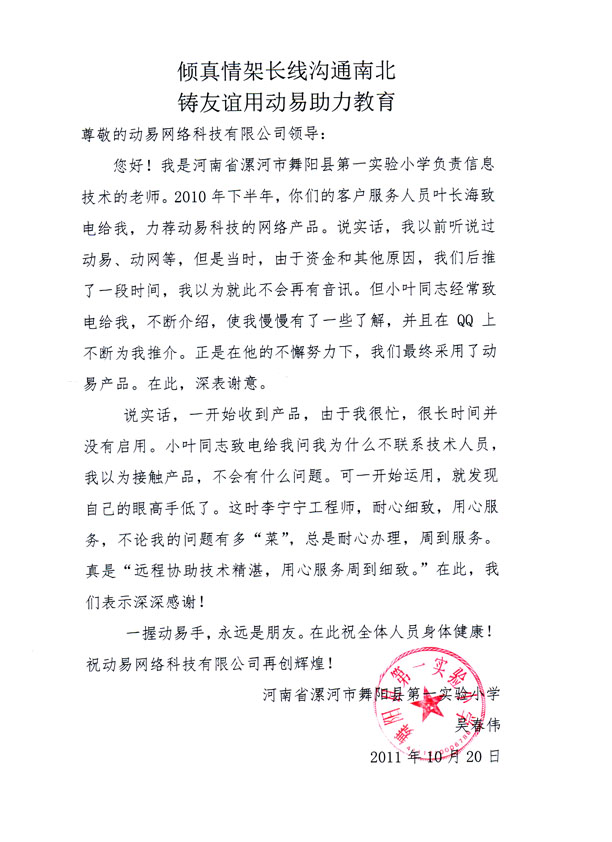 河南省漯河市舞阳县第一实验小学于今年5月选择了动易软件产品作为校园网软件平台,购买前期 ,客户对于动易客服人员叶长海的用心服务,始终站在客户发展角度,想客户所想的专业素质表达了赞赏和感谢。之后,动易的技术工程师李宁宁在售后技术支持服务中用心、耐心细致的为客户解决问题,服务非常到位和尽心,又得到客户的不断好评。
