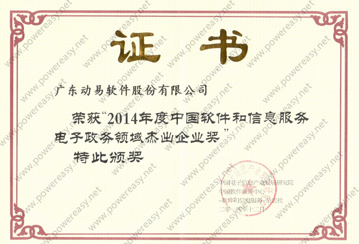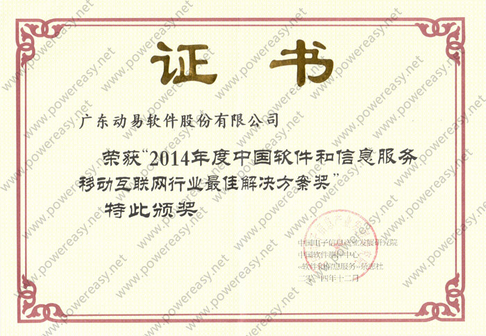在当晚的 “2014中国软件巅峰之夜”活动中,动易软件凭借多年服务电子政务的经验和在移动互联网领域的研发成果,荣获“电子政务领域杰出企业”、“移动互联网行业最佳解决方案”双料大奖。活动有多位产业主管部门领导出席,300多家全国知名软件和信息技术服务企业高管现场观礼。