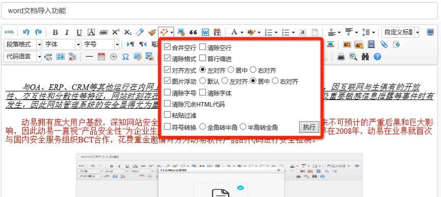 用户仅需点击“内容自动排版功能”按钮,并设置好自动排版的各种条件,系统便会自动根据设置条件对内容进行智能自动排版。自动排版的预设条件支持:合并空行、清除空行、清除格式、首行缩进、对齐方式、图片浮动方式、清除冗余 HTML 代码、符号转换等。内容自动排版功能最大化减轻编辑者的工作量,极大的提升信息发布和管理的效率。