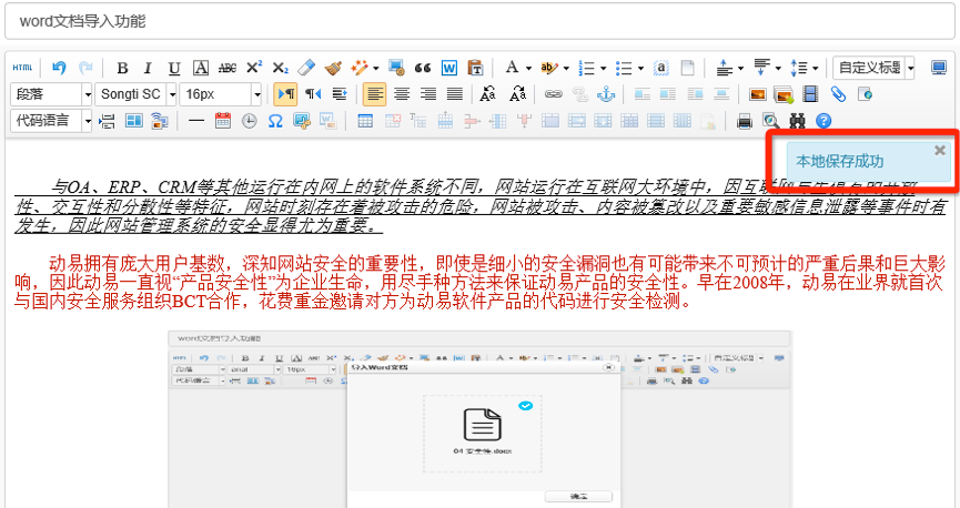 全新架构的动易SiteAzure 在内容编辑时,系统会自动、定时将文档临时保存在本地,可以有效的防止突然断网,浏览器崩溃所造成的内容丢失。