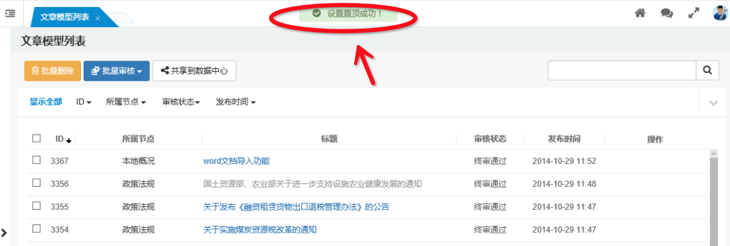 如下图,以设置某篇文章为置顶文章,设置后在当前页面直接操作成功并提示操作信息。