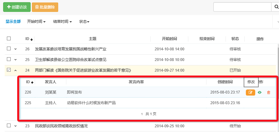 值得一提的是新信息列表还支持子表格的特性,能够很好的帮助后台管理人员查阅相关列表信息。下面以在线访谈功能的子表格特性为例,快速查阅单条访谈信息里的访谈实录的内容。