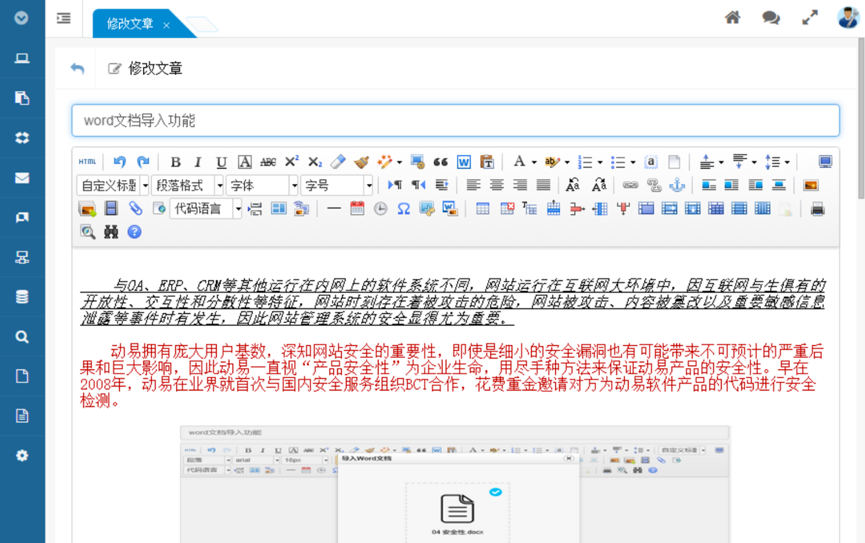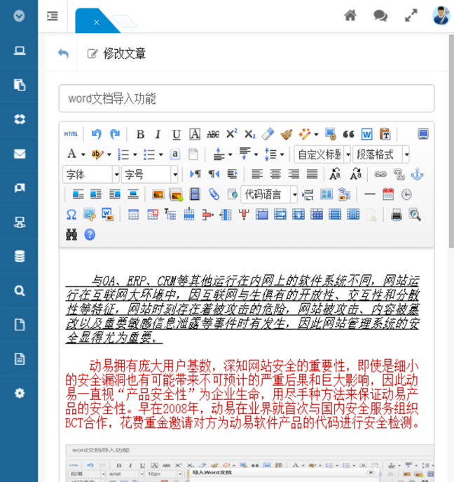 此外,动易SiteAzure 还对一些大型控件进行了选型和完善,如全新升级的内容编辑器,在保持原有编辑器功能的基础上,加入了 Word 文档直接导入、一键格式化红头文件、三屏无缝内容输入等功能;再如可视化图表控件,直观,生动,可交互,支持折线图(区域图)、柱状图(条状图)、饼图(环形图)等常见图表类型。