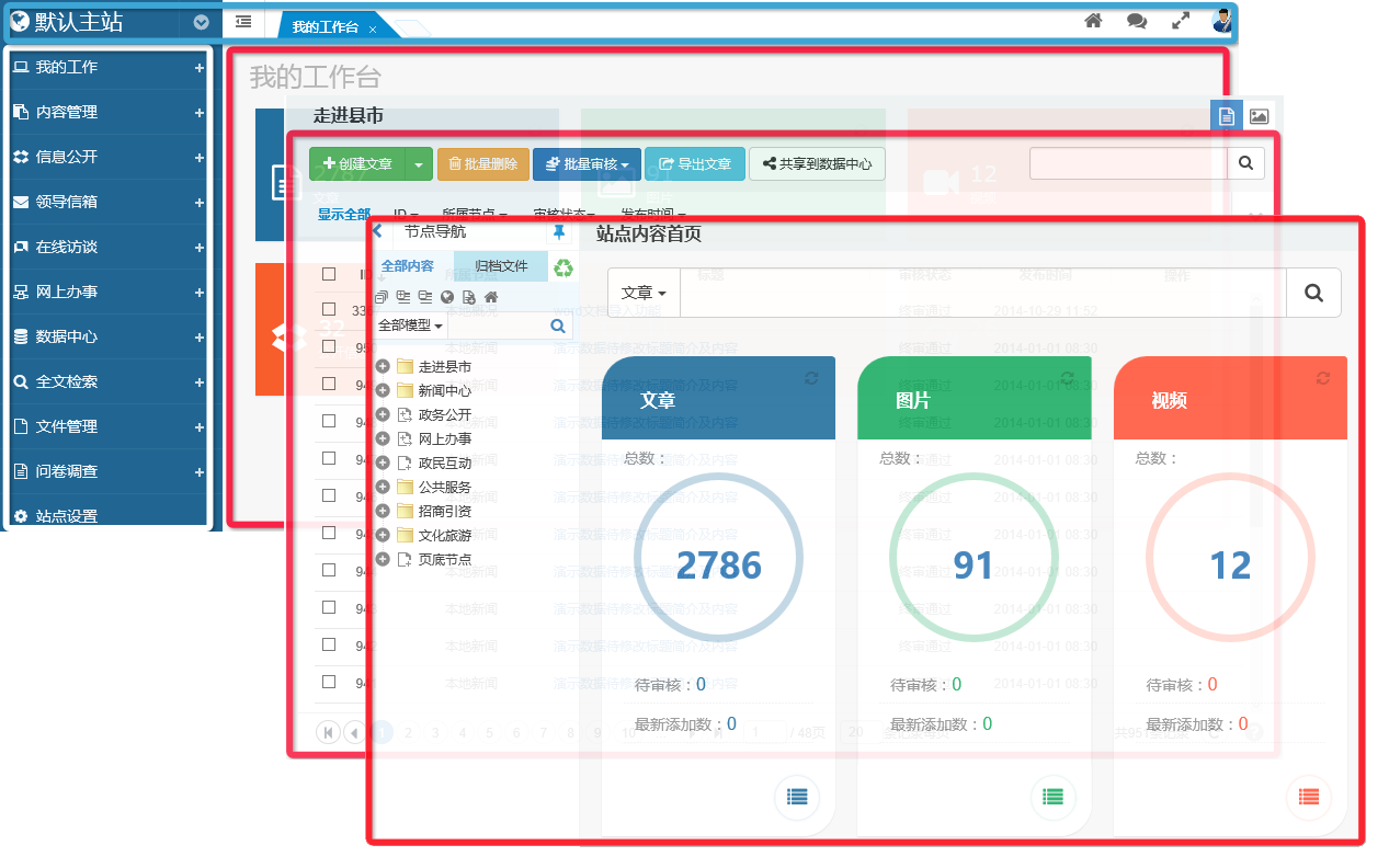 (进入内容管理,系统会自检当前栏目的内容数据,点击数字即可进入相关栏目)