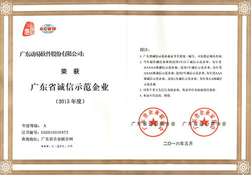 大会上对2015年度广东省优秀企业、优秀企业家、最佳诚信企业、诚信示范企业进行表彰,动易软件荣获“2015年度广东省诚信示范企业”称号并授予了荣誉证书与奖牌。动易软件获得此项殊荣,既是动易软件多年来诚信经营、优良服务的见证;也是社会各界对动易软件在履行社会责任、诚信守法等方面工作的充分肯定。