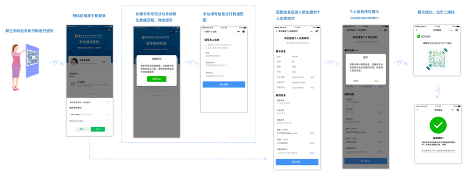 新生扫描小程序码,进入小程序。小程序自动申请获取当前微信绑定的手机号,并将手机号与新生报到数据进行匹配。匹配成功后,显示新生院系、专业、班级、个人信息等信息,新生确认个人信息后,系统生成二维码。