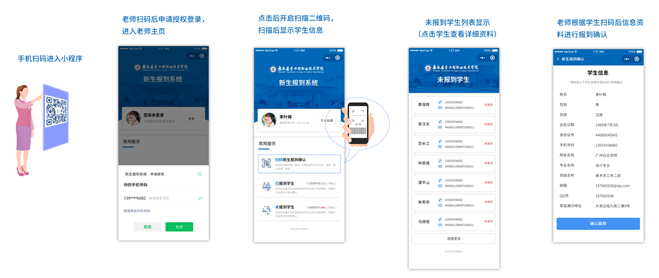 班主任可以扫描学生的报到二维码进行验证,也可以查看未报到/已报到的学生列表。