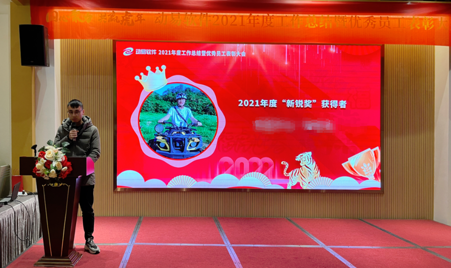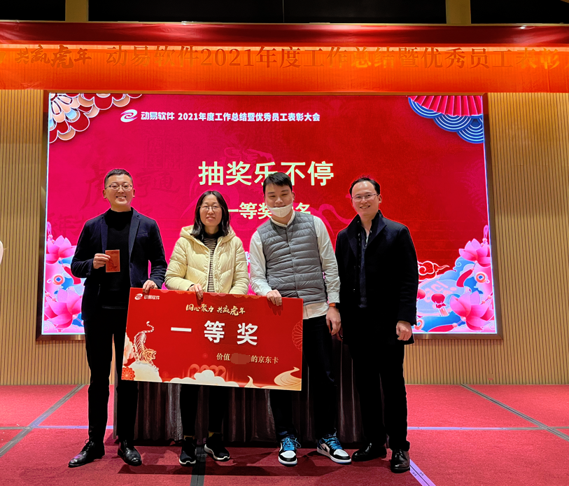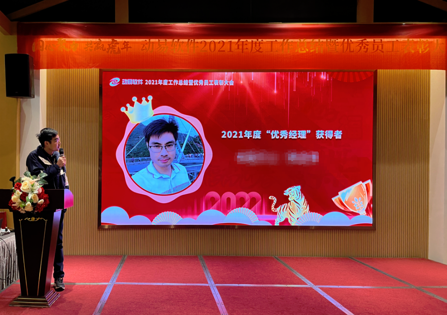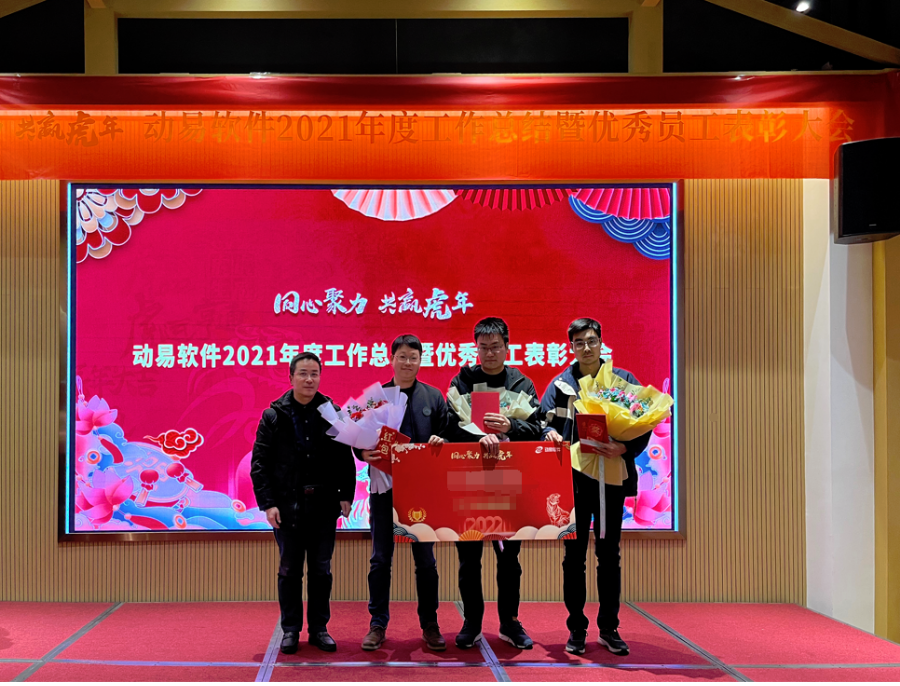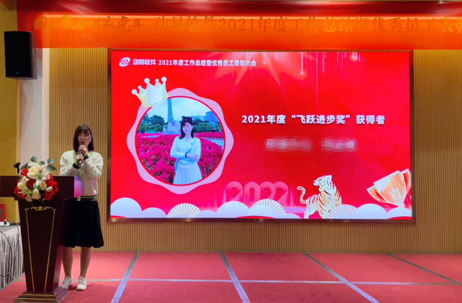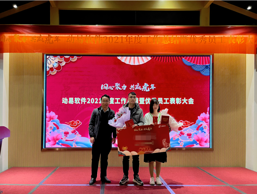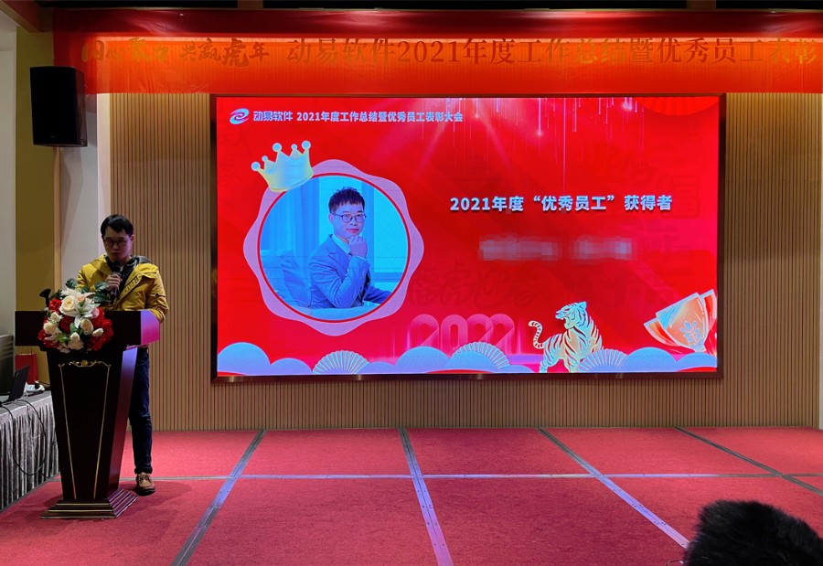公司对2021年表现优异的动易人进行了表彰鼓励, 主持人宣布了获得各奖项的名单,并由公司高层分别为获奖者颁发了表彰证书和奖金。