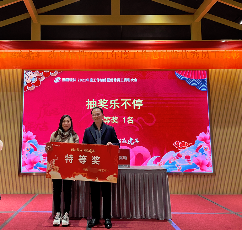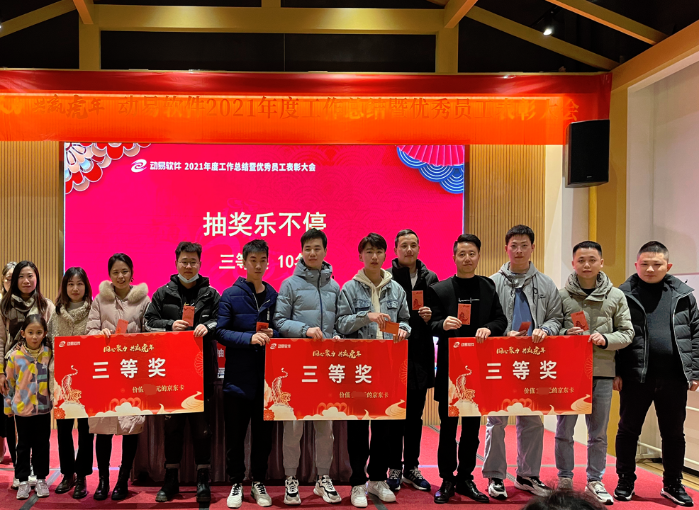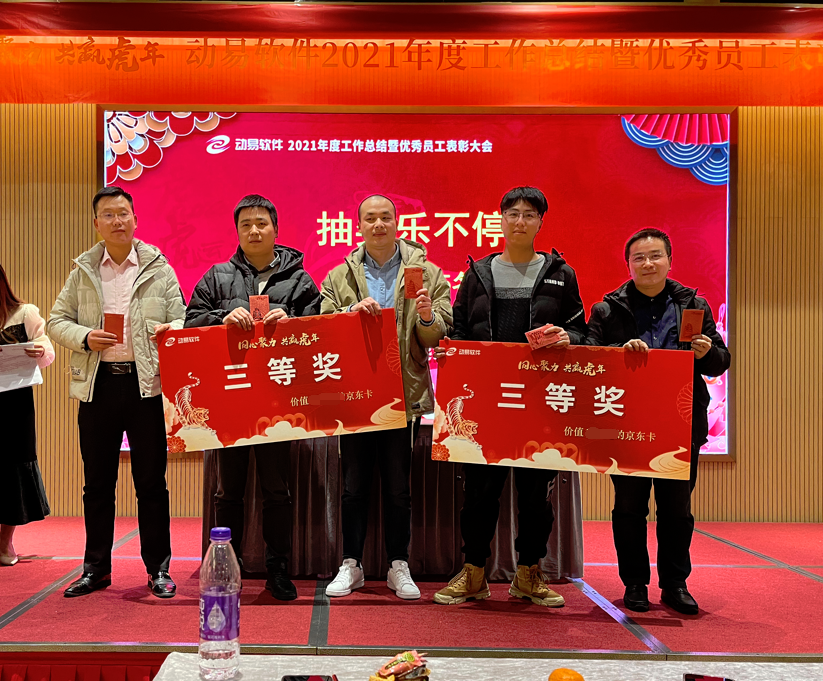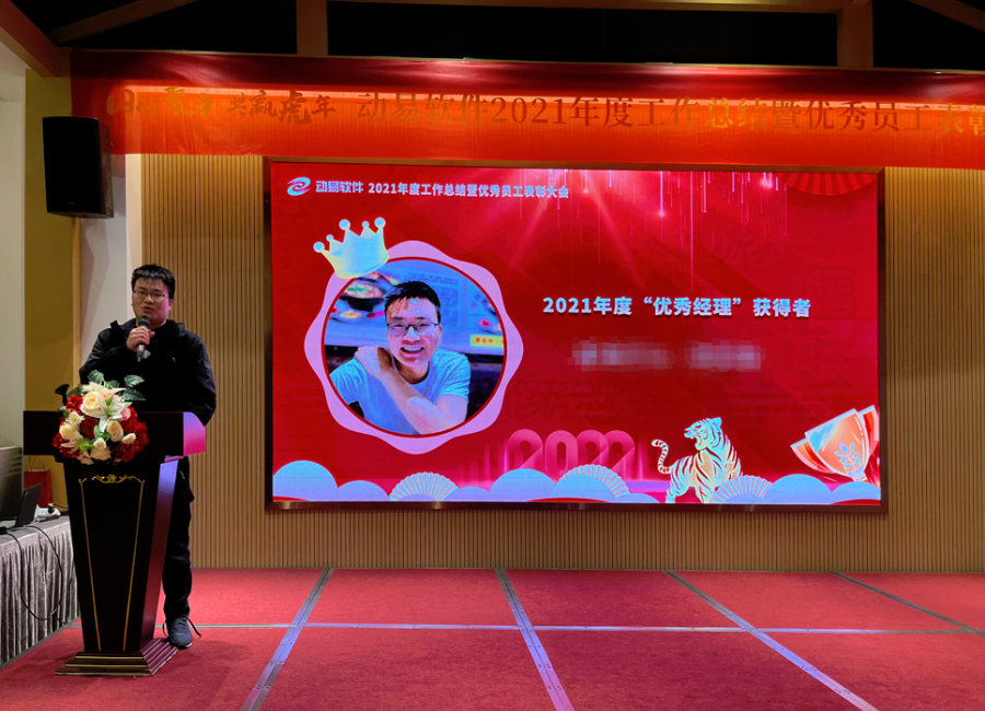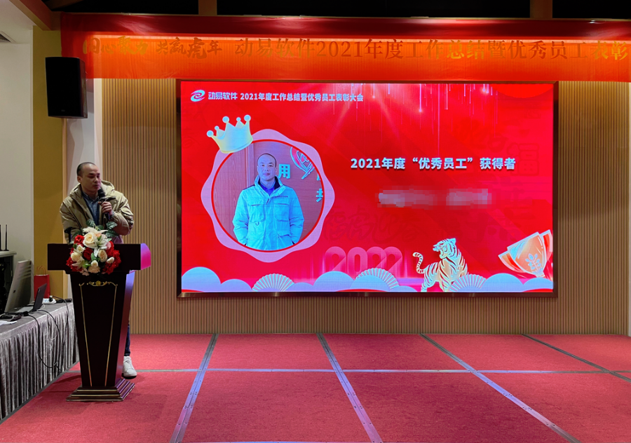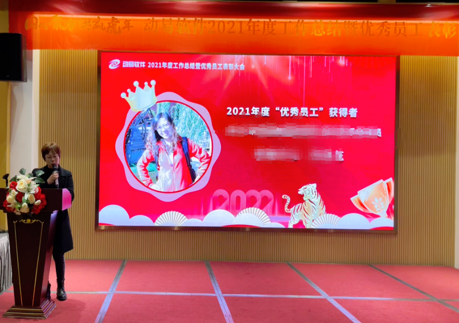 公司对2021年表现优异的动易人进行了表彰鼓励, 主持人宣布了获得各奖项的名单,并由公司高层分别为获奖者颁发了表彰证书和奖金。