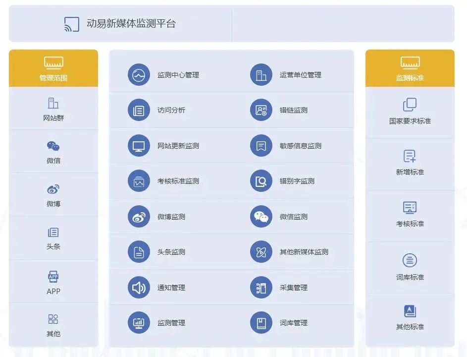动易新媒体监测平台以国务院办公厅出台的各项文件(如《关于推进政务新媒体健康有序发展的意见》《政府网站与政务新媒体检查指标》为依据,综合运用各种信息化手段和前沿技术,根据动易十多年行业建设与运营经验,为行业客户提供的一套完整的综合新媒体监测解决方案。