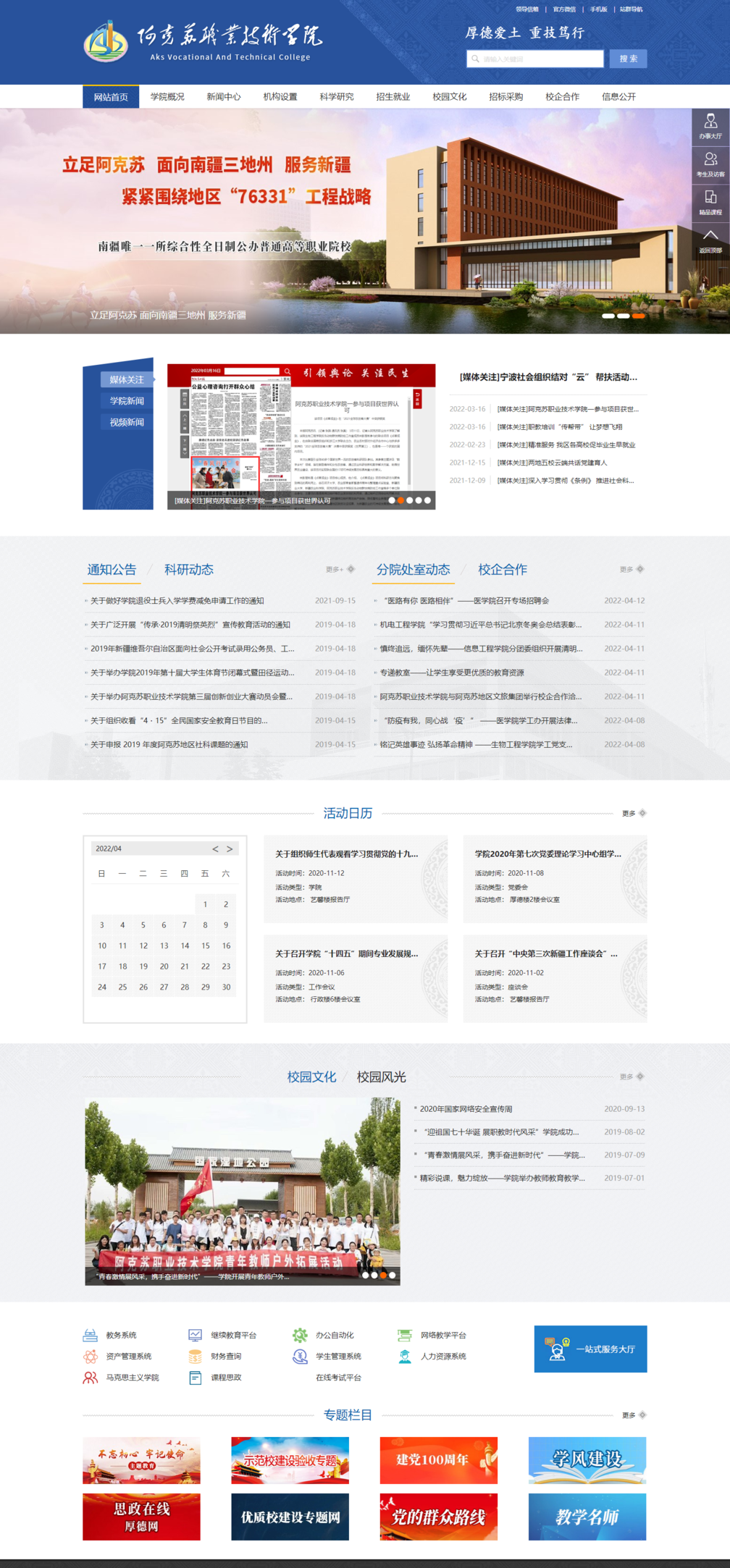 项目采用动易高校门户网站建设解决方案,以“统一软件平台”、“统一数据中心”、“统一权限管理”为核心,成功建设阿克苏职业技术学院网站群集约化平台,一体化服务集成、全媒体发布管理、部署学院门户主站和职能部门、二级学院及专题网站共计26个子站,规范了校园网主站和各二级网站的建设标准,实现学院网站的统一管理、统一运维、统一部署和统一监控。